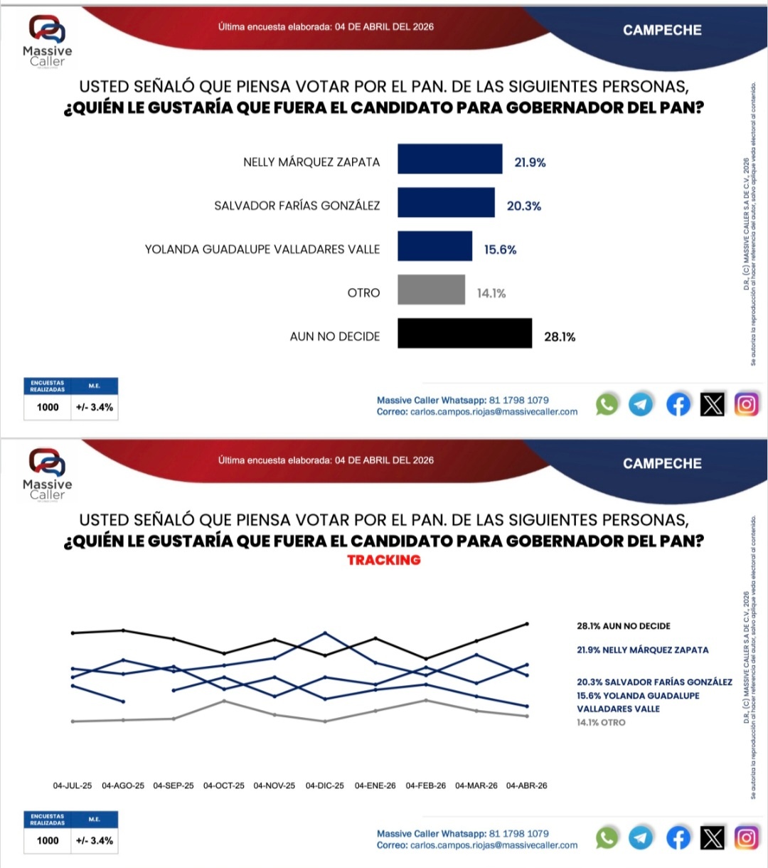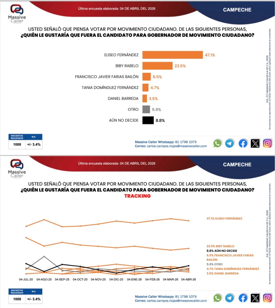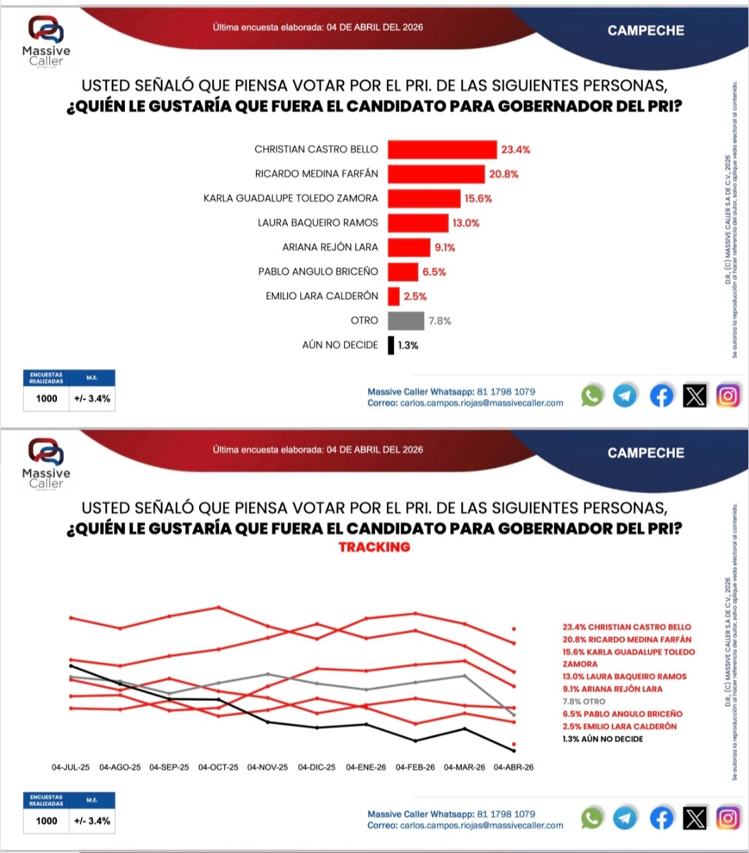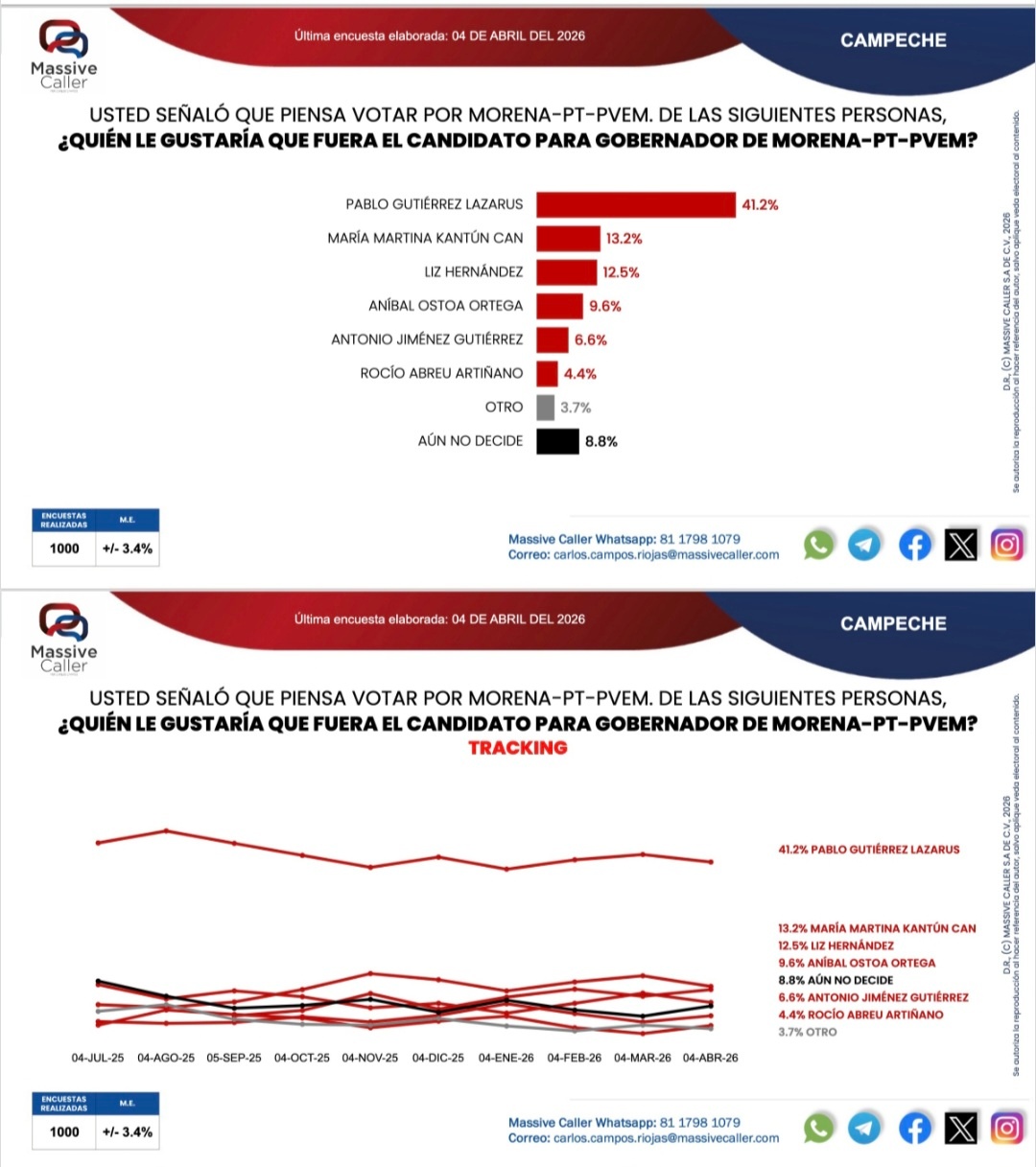 En Campeche, el partido Movimiento de Regeneración Nacional en alianza con Partido del Trabajo y Partido Verde Ecologista de México continúan arriba en la preferencia al voto por la gobernadora, reveló la última encuesta de Massive Caller elaborada el 3 de abril rumbo a las elecciones del 2027.