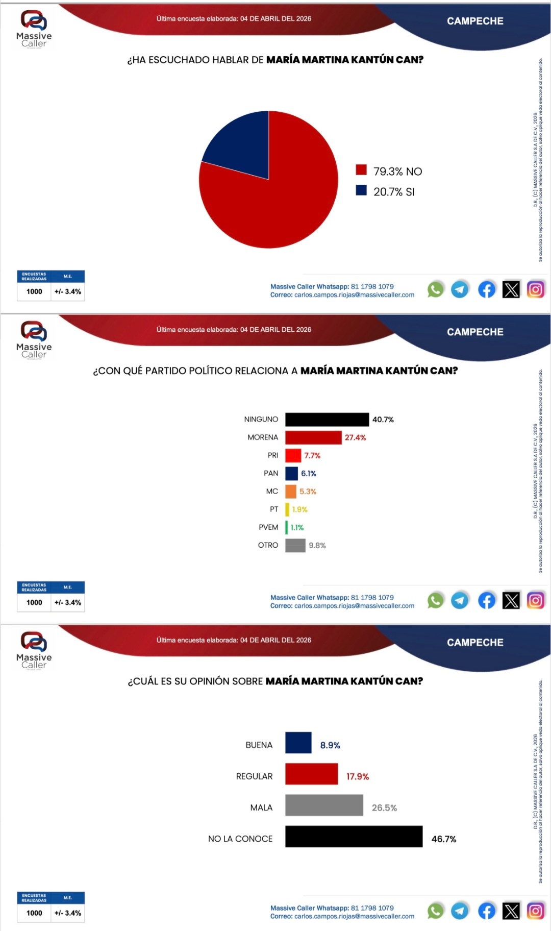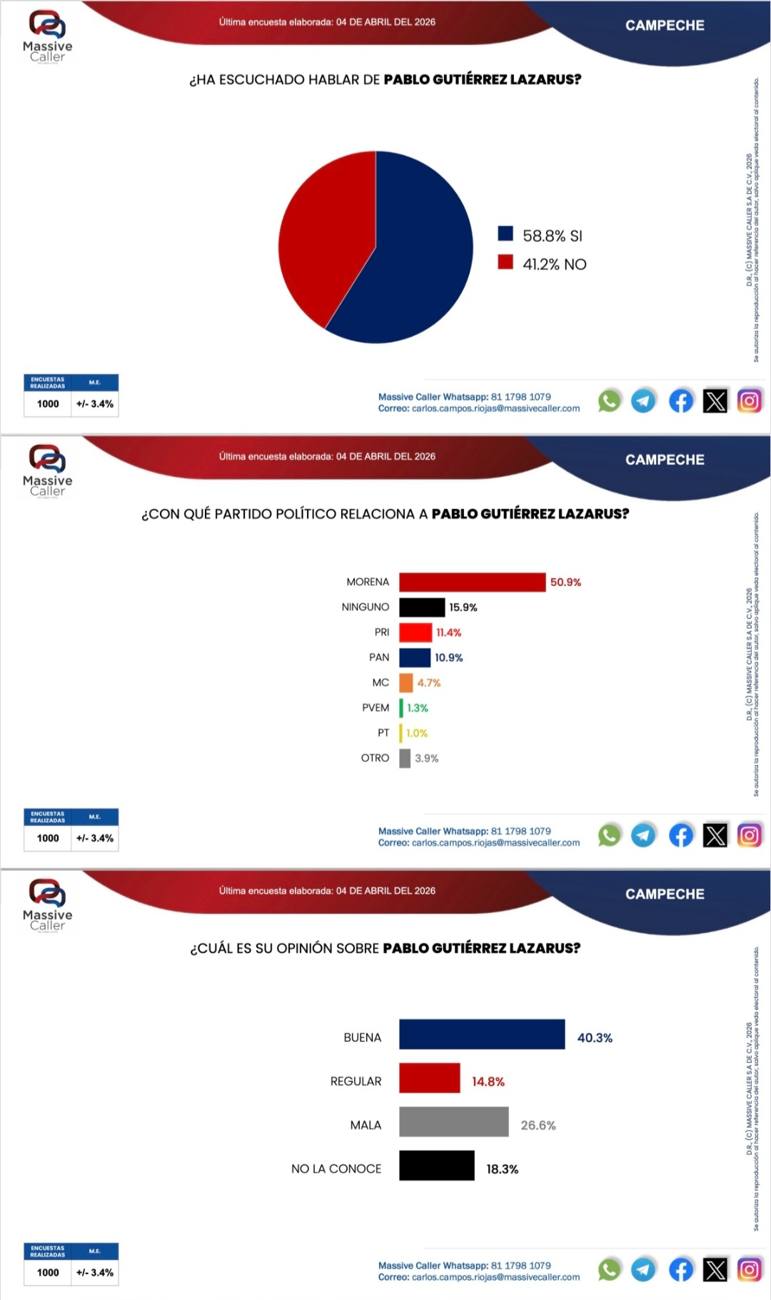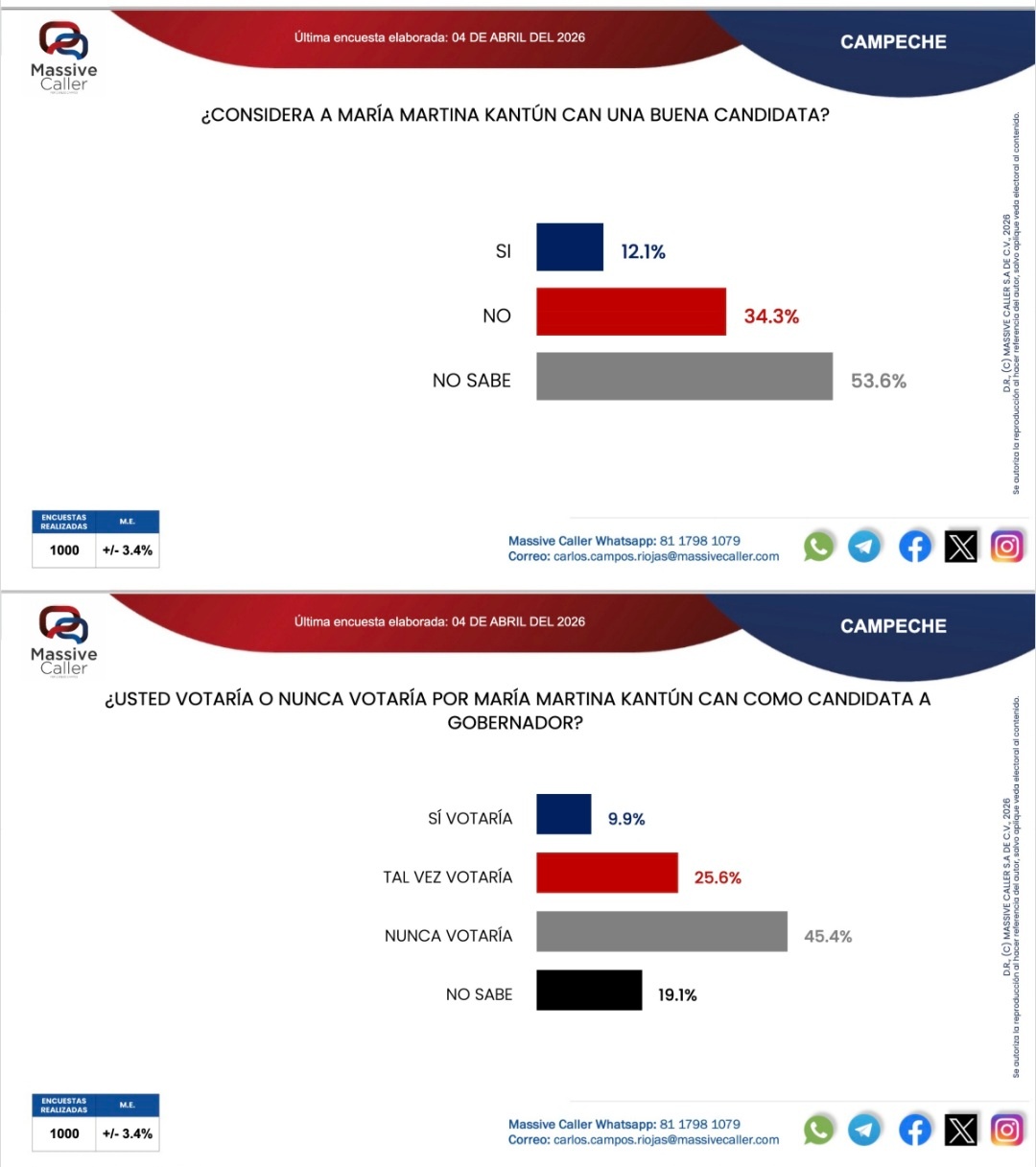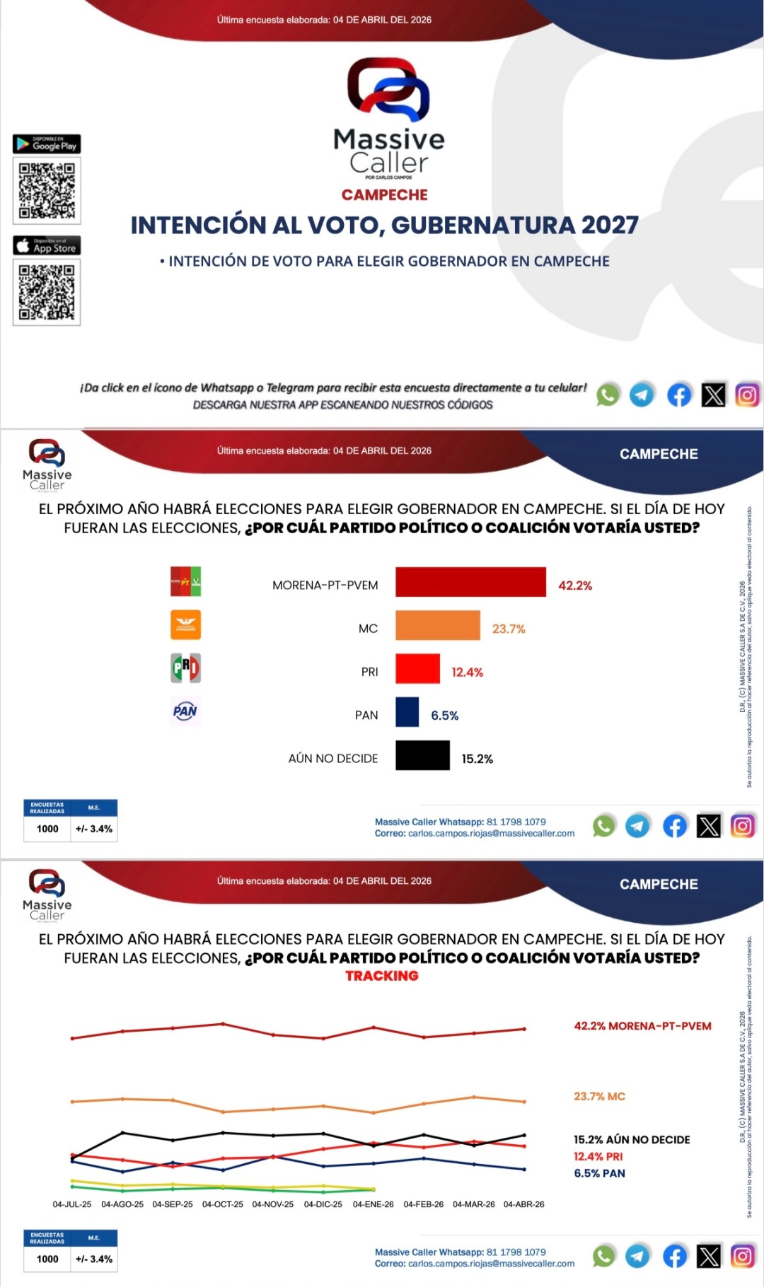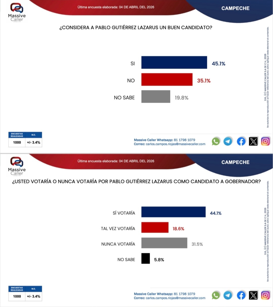 En Campeche, el partido Movimiento de Regeneración Nacional en alianza con Partido del Trabajo y Partido Verde Ecologista de México continúan arriba en la preferencia al voto por la gobernadora, reveló la última encuesta de Massive Caller elaborada el 3 de abril rumbo a las elecciones del 2027.