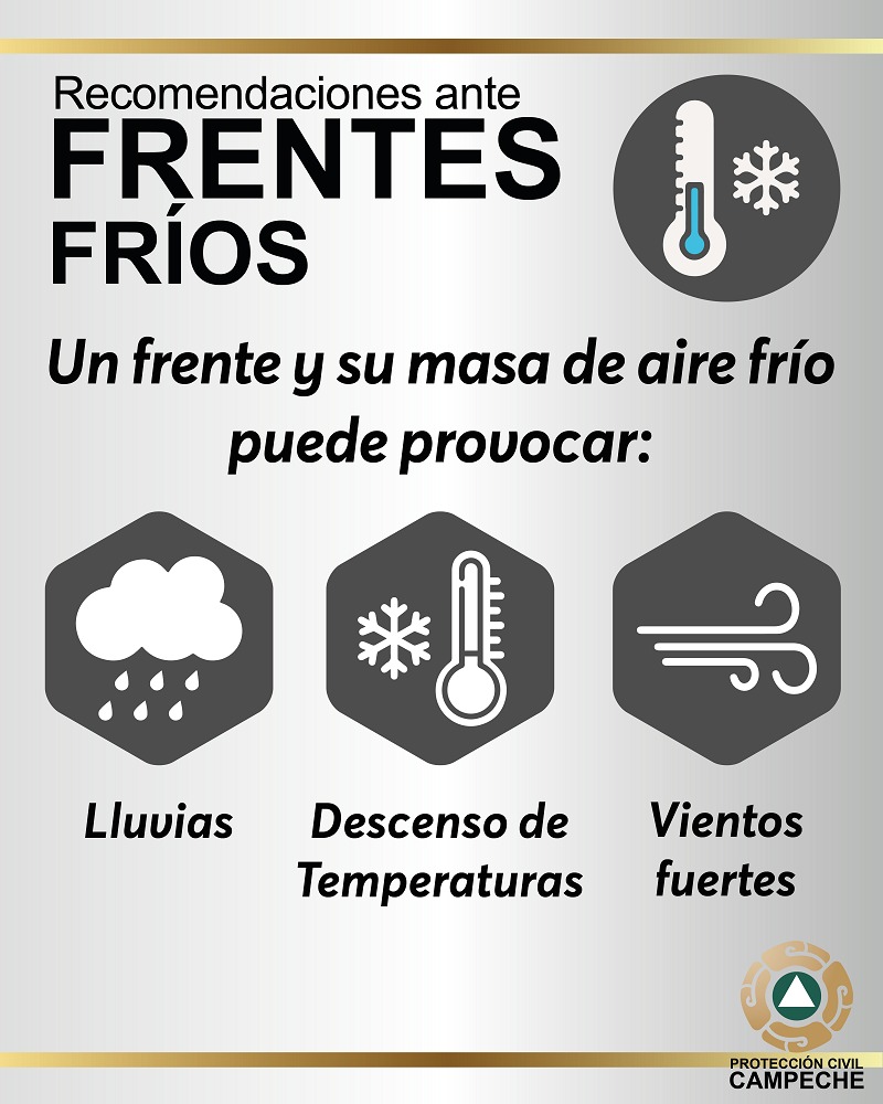 Se prevé el arribo a Campeche del Frente Frío número 45 durante el transcurso del próximo jueves. Este sistema es impulsado hacia el Sureste por la Masa de Aire Frío que lo genera. Previo a la llegada de dicho Frente, una Vaguada pre frontal propiciará este miércoles por la tarde/noche, nublados con potencial de desarrollo de lluvias algunas de moderadas a puntualmente fuertes en diversos puntos del Estado, las cuales podrán estar acompañadas de actividad eléctrica.