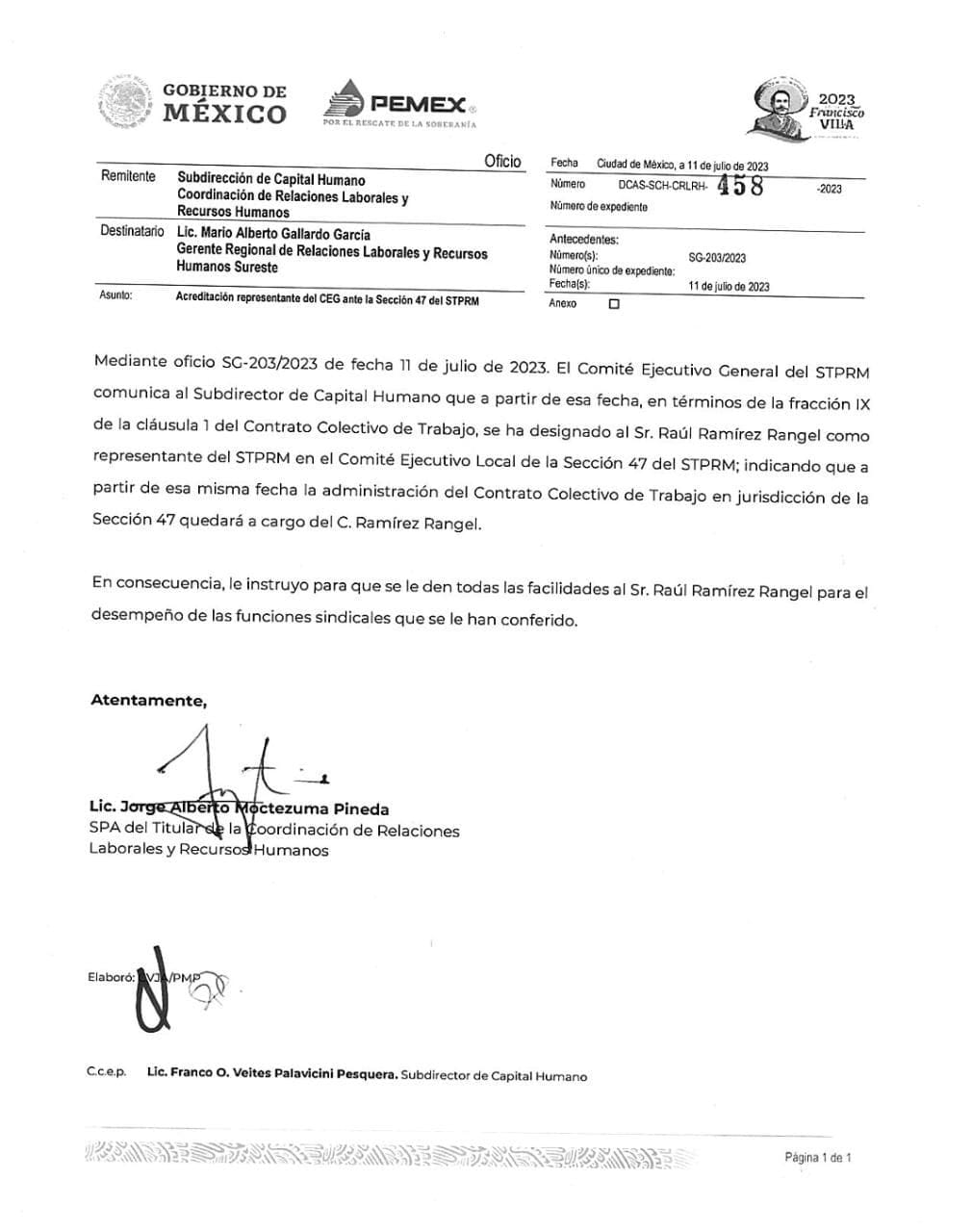 Así también para su conocimiento al Lic. Jorge Alberto Moctezuma Pineda, SPA del Titular de la Coordinación de Relaciones Laborales y Recursos Humanos; según el oficio, el CEG del STPRM comunica que a partir de esa fecha (11 de julio), en términos de la fracción IX de la cláusula 1 del Contrato Colectivo de Trabajo (CCT), se designó a Ramírez Rangel (quien era Secretario del Trabajo en el CEG) como representante del STPRM en el Comité Ejecutivo Local de la Sección 47 del STPRM, de tal modo, la administración del CCT en jurisdicción de la Sección 47 quedará a su cargo.