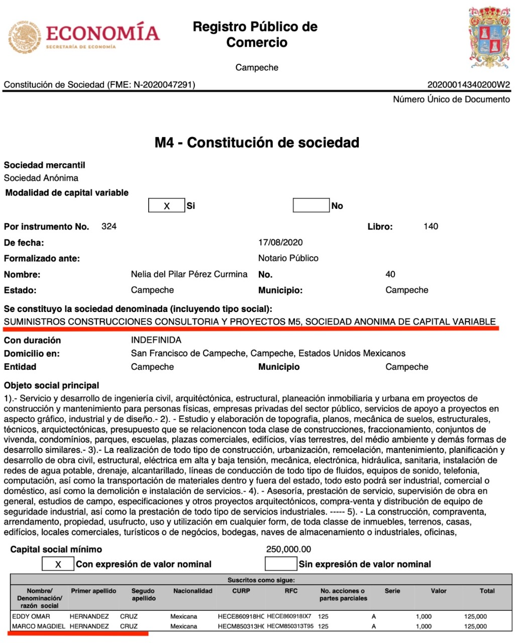 Llama la atención, por ejemplo, la razón social Suministros, Construcciones, Consultoría y Proyectos M5 SA de CV, una empresa que tiene como socios o accionistas a los hermanos Marco Magdiel y Eddy Omar Hernández Cruz, que en la ac tual administración morenista ha ejercido las siguientes obras: Sistema de abastecimiento, distribución y almacenamiento en la localidad de Matamoros, municipio de Escárcega, por un monto de $12,407,323.07 pesos; además, el mejoramiento del sistema de distribución de agua potable de la localidad de Benito Juárez, municipio de Candelaria. 2da etapa y última, por un monto de $13,529,937.60 pesos; por último, mejoramiento del sistema de distribución de agua potable de la localidad de Benito Juárez, en Candelaria, 1ra etapa, por $6,685,930.67 pesos.