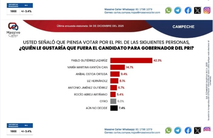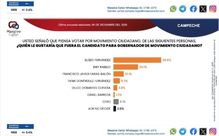 Cabe precisar que MORENA como partido aventaja a Movimiento Ciudadano, PRI y PAN; pero por candidatos, Eliseo Fernández de MC superaría al actual alcalde carmelita y, si así se mantuviera la tendencia y Eliseo lograra quitarse legalmente la inhabilitación de los 20 años, los candidatos que competirían en el 2027 para la gubernatura de Campeche, según Massive, serían Lazarus y Montufar.