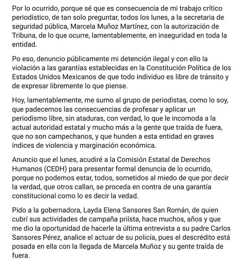 El comunicador recuperó su libertad minutos después y negó haber tomado alguna fotografía así como estar alcoholizado. Dijo que esto es una represión por la labor que realiza y los cuestionamientos a la titular de la SPSC todos los lunes en la Avenida Costera.