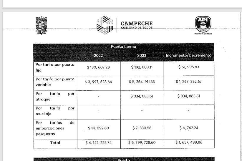 El total de ingresos que tuvo el Puerto Isla de Carmen en el 2022 por tarifa en cobros fue por 95,781,564.37; mientras que en el 2023 fue por 104,229,954.71 pesos, lo que significa que en el 2023 tuvo un incremento en ingreso por la cantidad de 8,448,390.34 pesos. Mientras que el Puerto de Lerma, recaudo por movimiento de embarcaciones en el 2022 la cantidad de 4,142,228.74 pesos, y en el 2023 la cantidad de 5,779,728.60 pesos; en tanto el Puerto de Seybaplaya en el 2022 captó de ingresos 18,609,799.21 pesos, y en el 2023 la captación fue por 26,108,517.96 pesos, lo que significa que en el 2023 se incrementó el ingreso en la Puerto de Seybaplaya fue por 7,49,738.75 pesos.