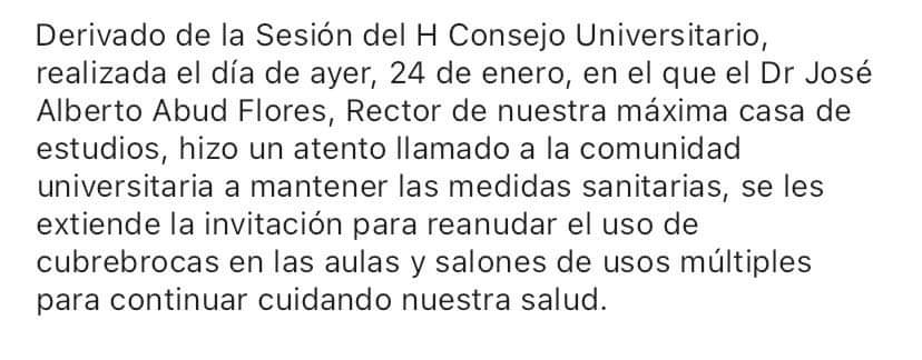Instituciones educativas informaron a los alumnos y personal que se tendrá que usar el cubrebocas de manera obligatoria. La información filtrada a través de redes sociales en una reciente reunión de la Universidad Autónoma de Campeche (UAC).