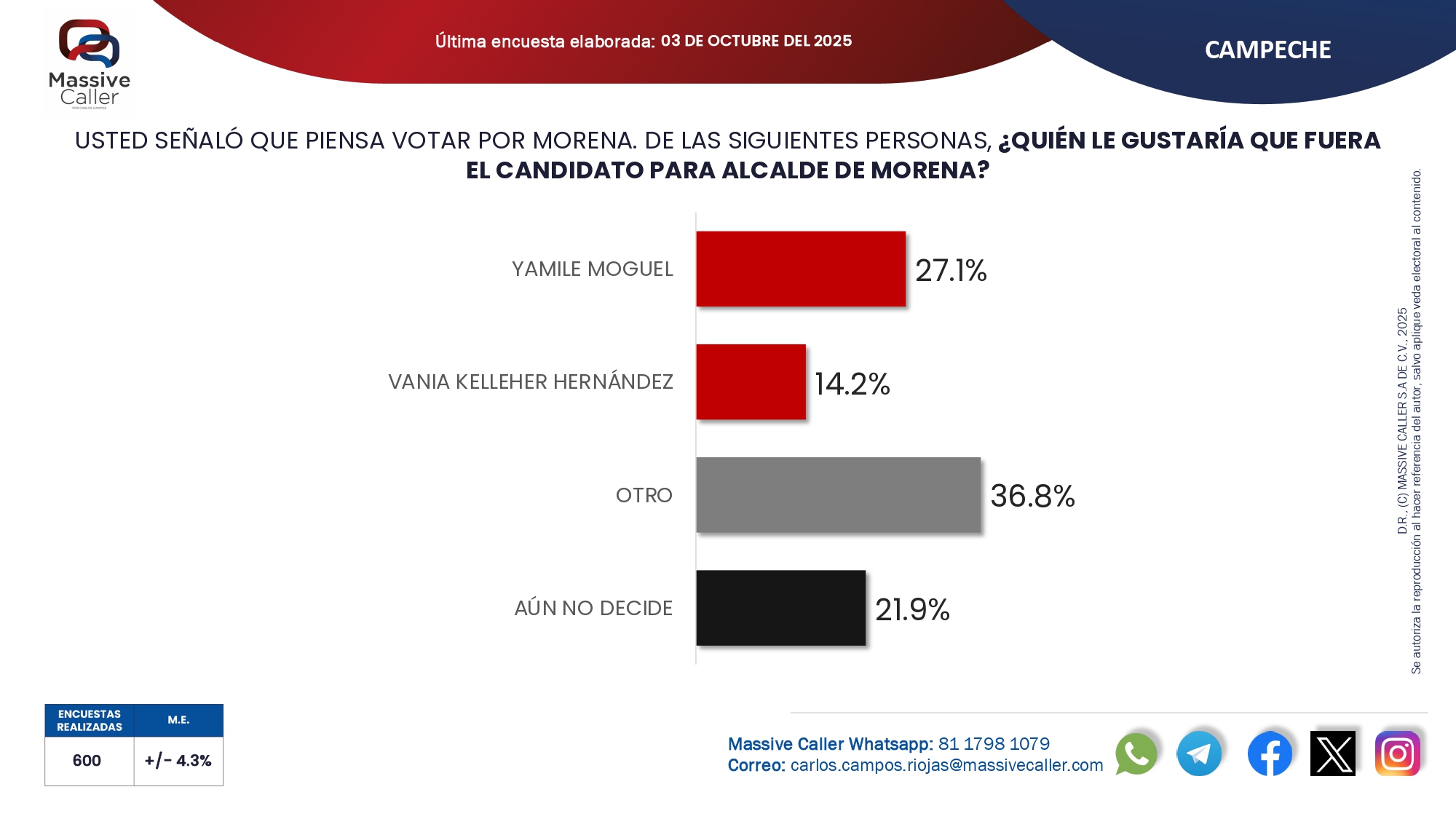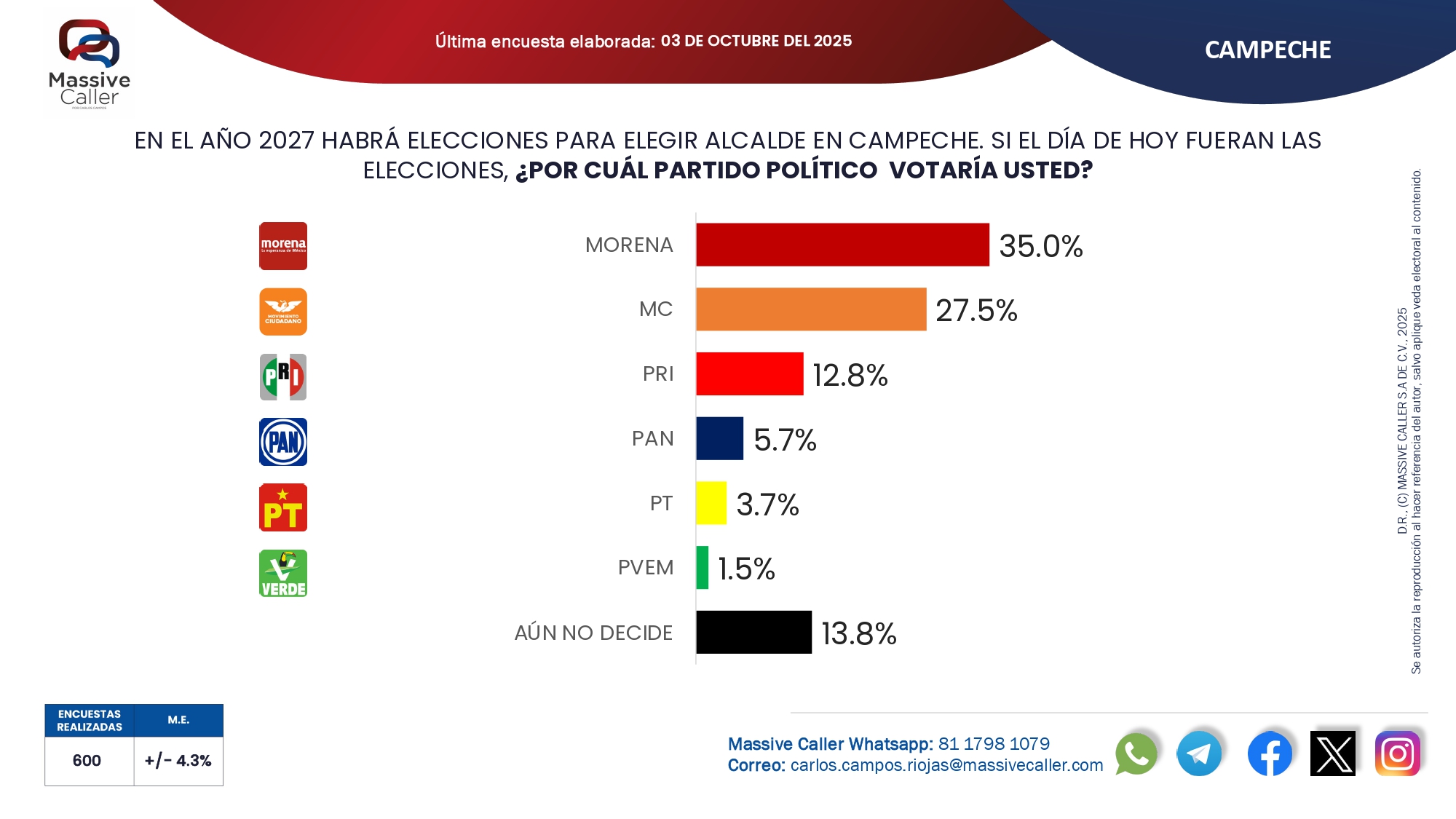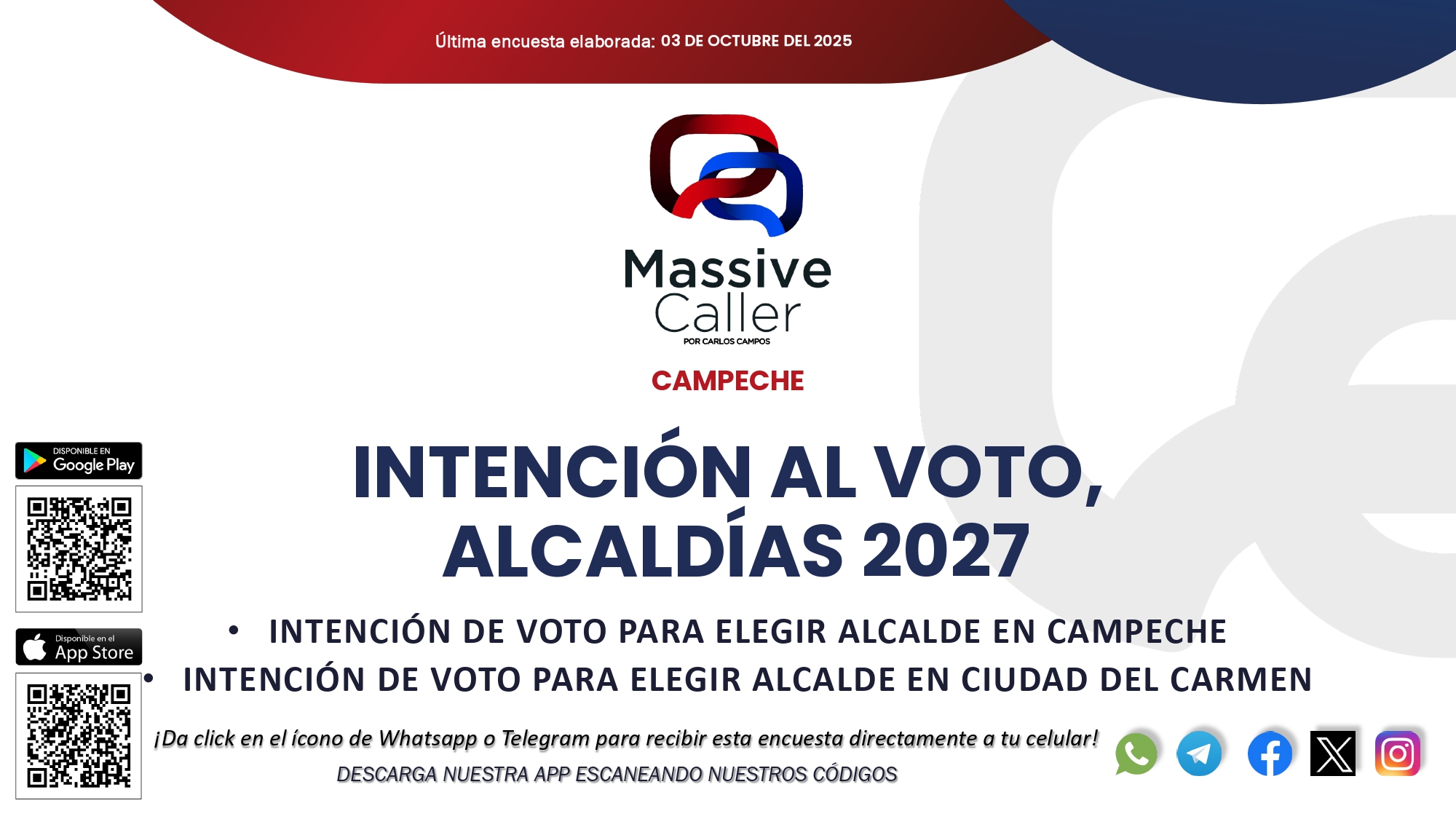 Encuesta de tendencias de los precandidatos a la alcaldía de Campeche rumbo al 2027-diciembre 2025. Metodología: Tipo de encuesta: Telefónica automatizada. Población muestra: Población muestra hombres/mujeres habitantes de la entidad municipal encuestada, mayores de 18 años. Tipo de muestra: Aleatorio representativo. Nivel de confianza: 95%. Margen de error: +/- 3.8%. Fecha de levantamiento: 17 de diciembre, 2025.