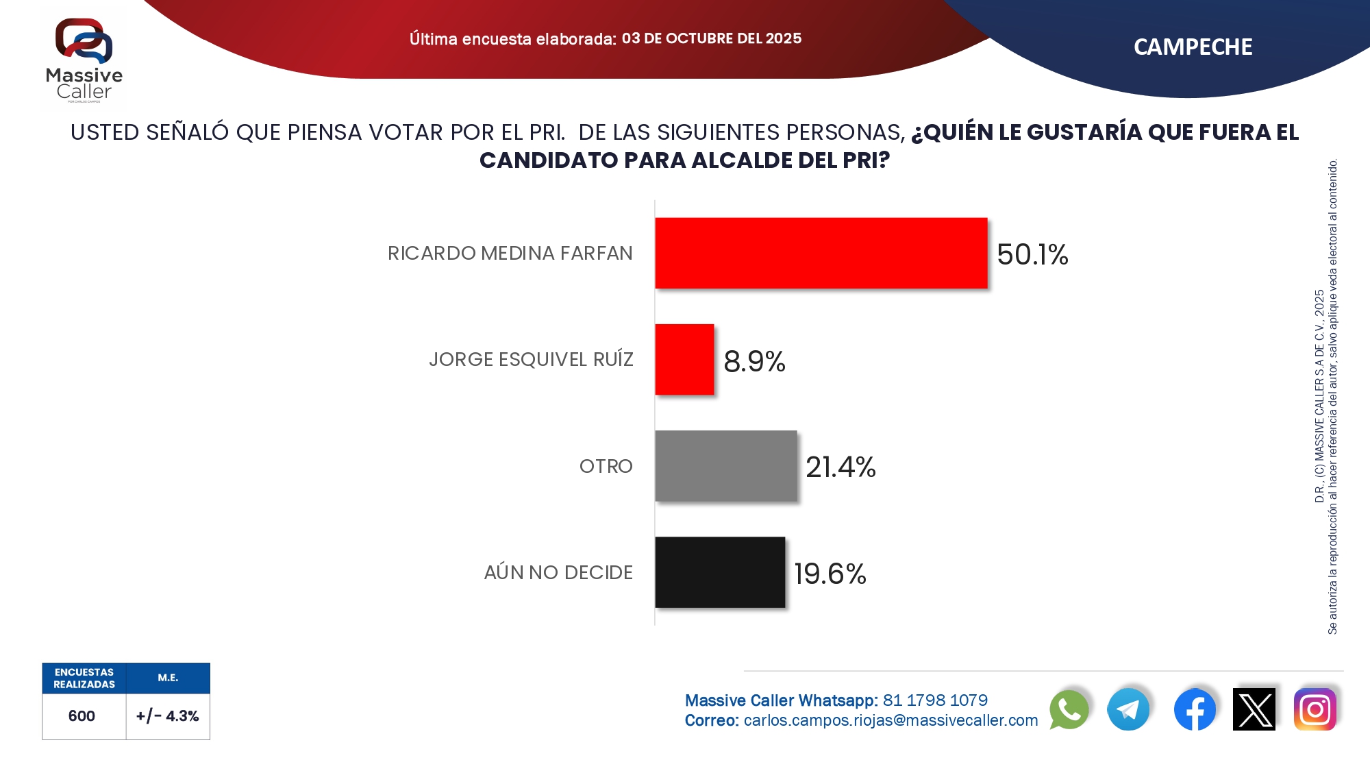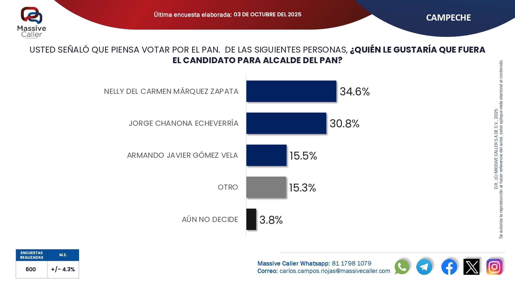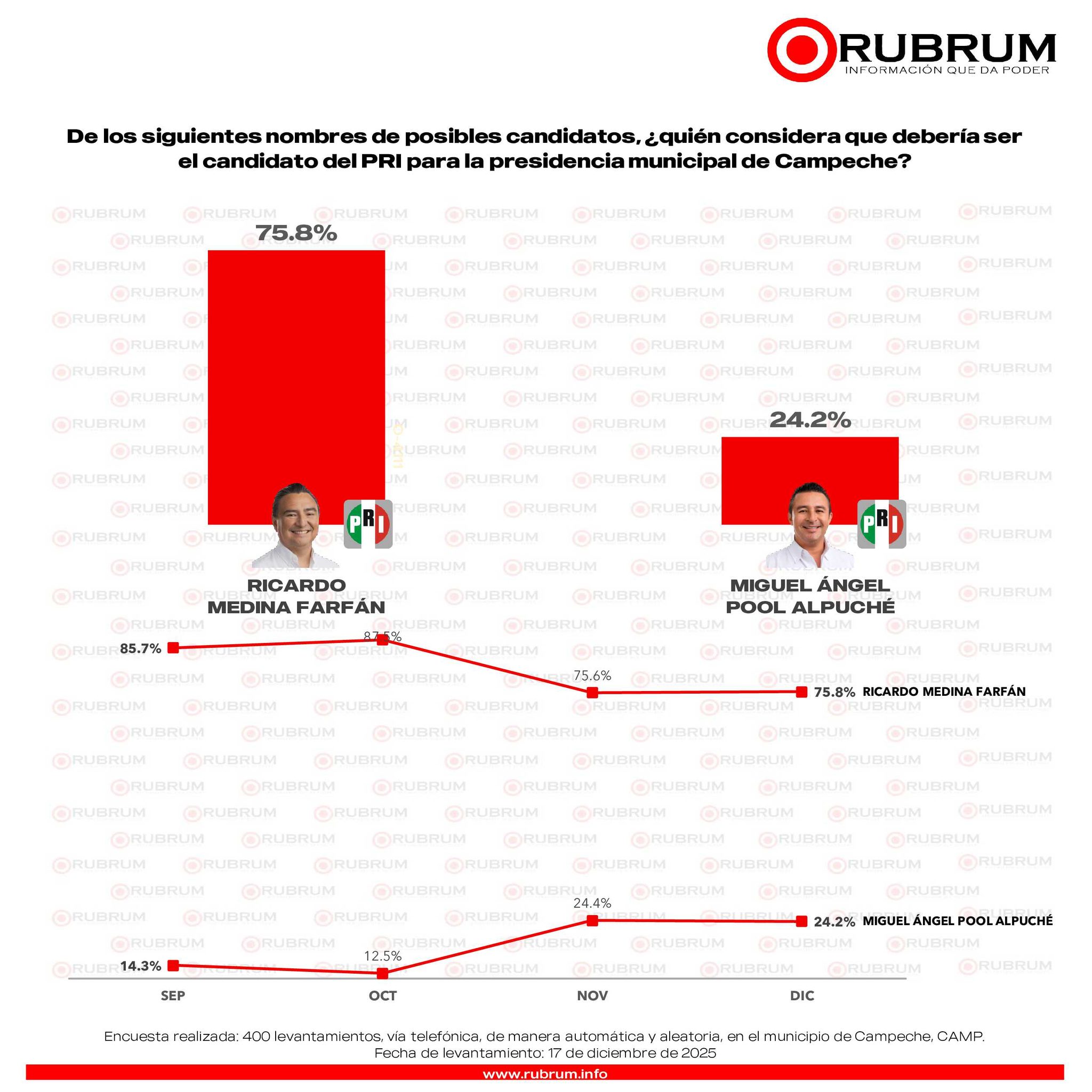 Encuesta de tendencias de los precandidatos a la alcaldía de Campeche rumbo al 2027-diciembre 2025. Metodología: Tipo de encuesta: Telefónica automatizada. Población muestra: Población muestra hombres/mujeres habitantes de la entidad municipal encuestada, mayores de 18 años. Tipo de muestra: Aleatorio representativo. Nivel de confianza: 95%. Margen de error: +/- 3.8%. Fecha de levantamiento: 17 de diciembre, 2025.