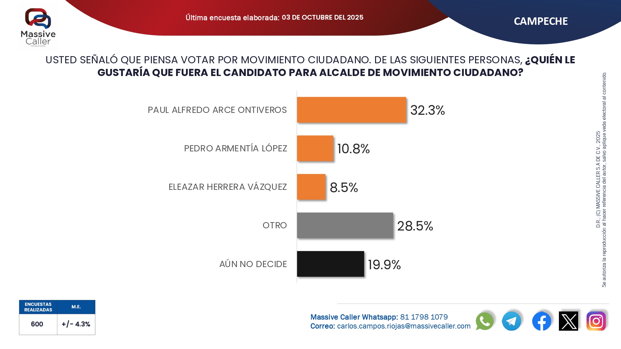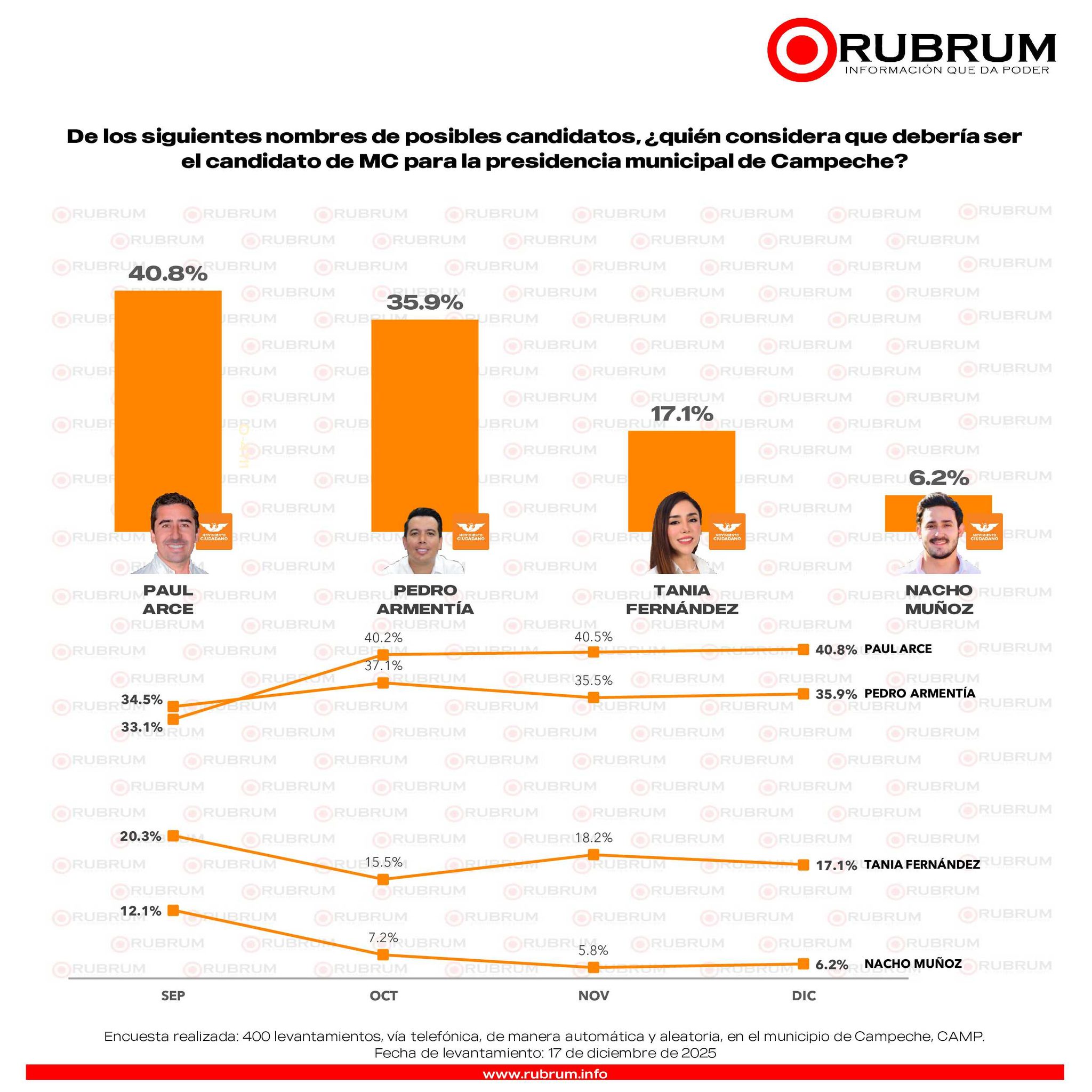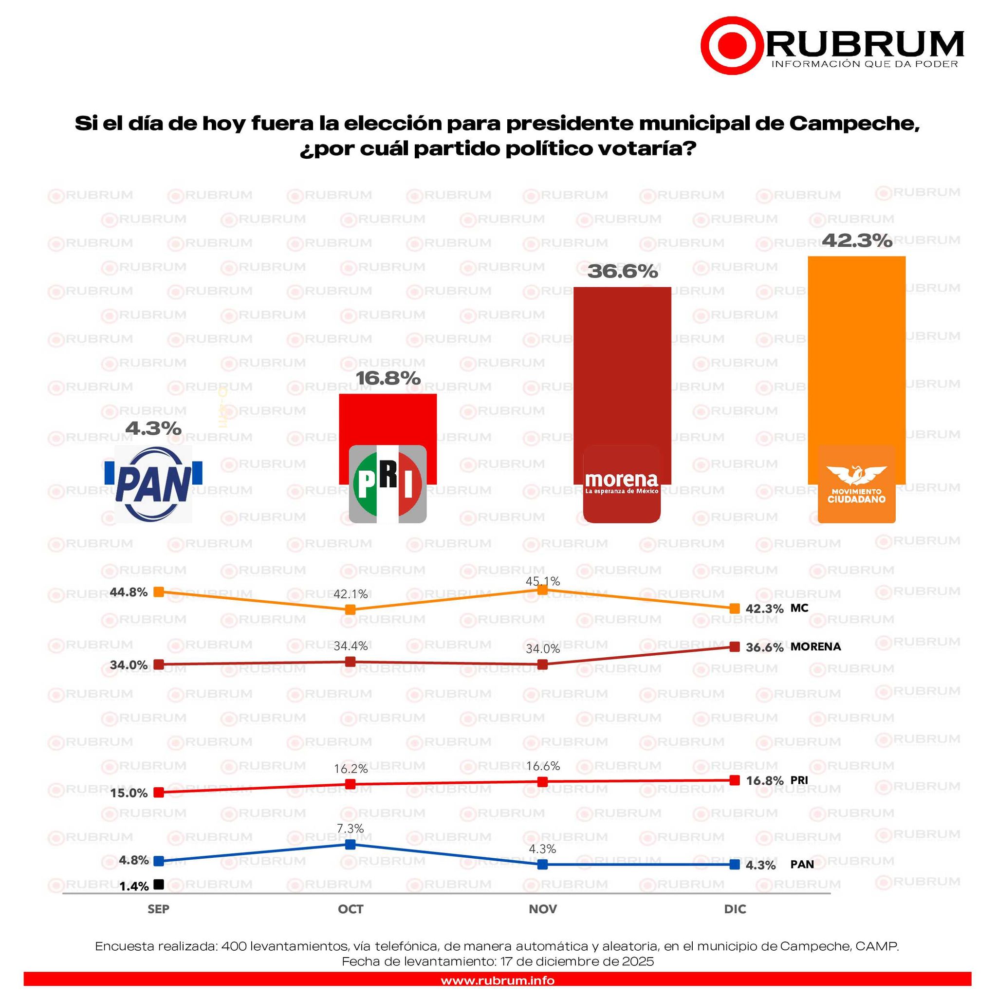 Encuestas recientes muestran que Movimiento Ciudadano se mantiene como una fuerza competitiva en el estado, y la brecha con Morena (el partido oficialista a nivel estatal) se ha reducido, indicando un panorama electoral reñido para 2027, tanto para la gubernatura como para la capital. Massive Caller y RUBRUM han realizado encuesta donde muestran a los “favoritos” para quedarse con la capital de la entidad campechana, si hoy fueran las elecciones.