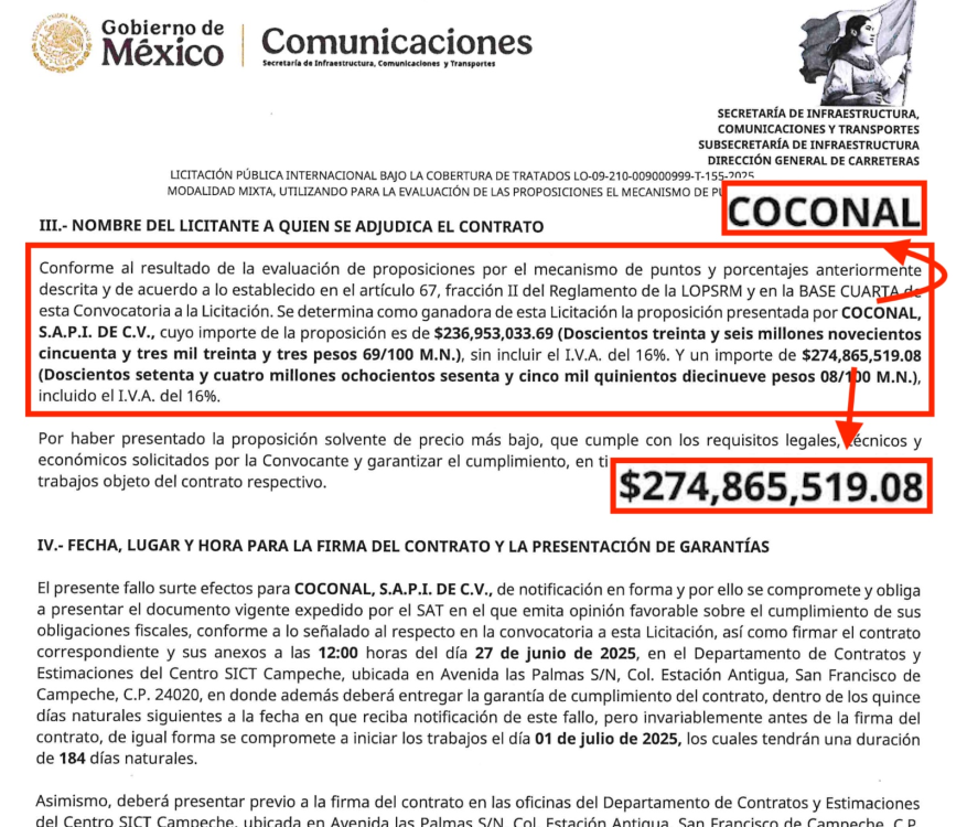 El pasado 25 de junio, la SICT, a través de José Antonio Ramírez Culebro, director ejecutivo de construcción de carreteras federales; Víctor de la Cruz Bautista, director de construcción; y Ricardo Olvera González, subdirector de obras especiales, entregó el fallo a la firma COCONAL, que tiene su domicilio fiscal en la Ciudad de México.
