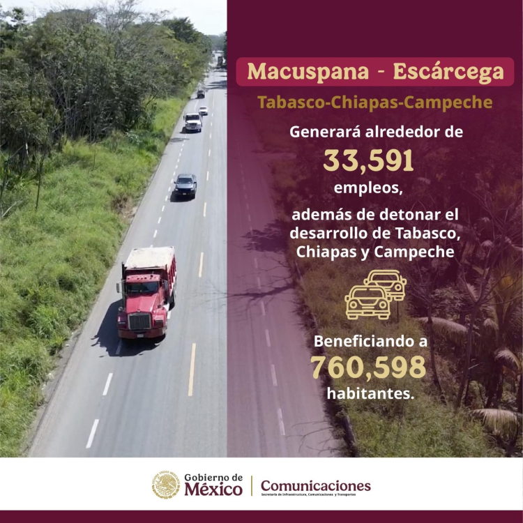 Para 2025, la SICT ya adjudicó un total de cuatro contratos para la intervención de 16 kilómetros del tramo Macuspana-Escárcega con una inversión de 1,500 millones de pesos, de los cuales ya se adjudicaron en obra física la suma de $1,221 millones 112 mil 447.63 pesos; para el 2026 se trabajará en 38 kilómetros adicionales, en 2027 otros 38 kilómetros y la obra concluirá en 2028.