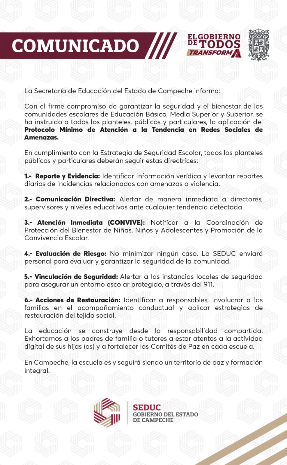 Dijo que el protocolo de actuación fue presentado el día de ayer y pidió a todos los involucrados reportar cualquier situación anómala en las escuelas de toda la geografía estatal.