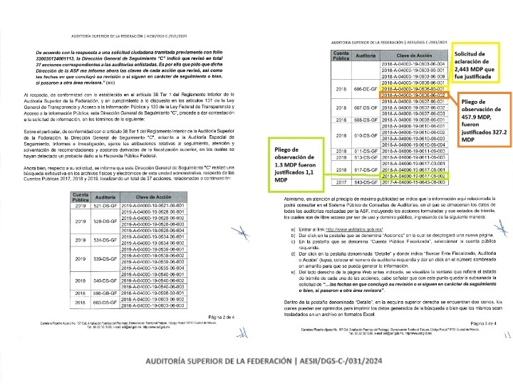 En una respuesta a una petición de información en la que se solicitó que la Dirección General de Seguimiento C de la ASF informara las acciones específicas dentro de las auditorías que había revisado de las cuentas públicas de 2017 a 2019, indicó que revisó un total de 37.