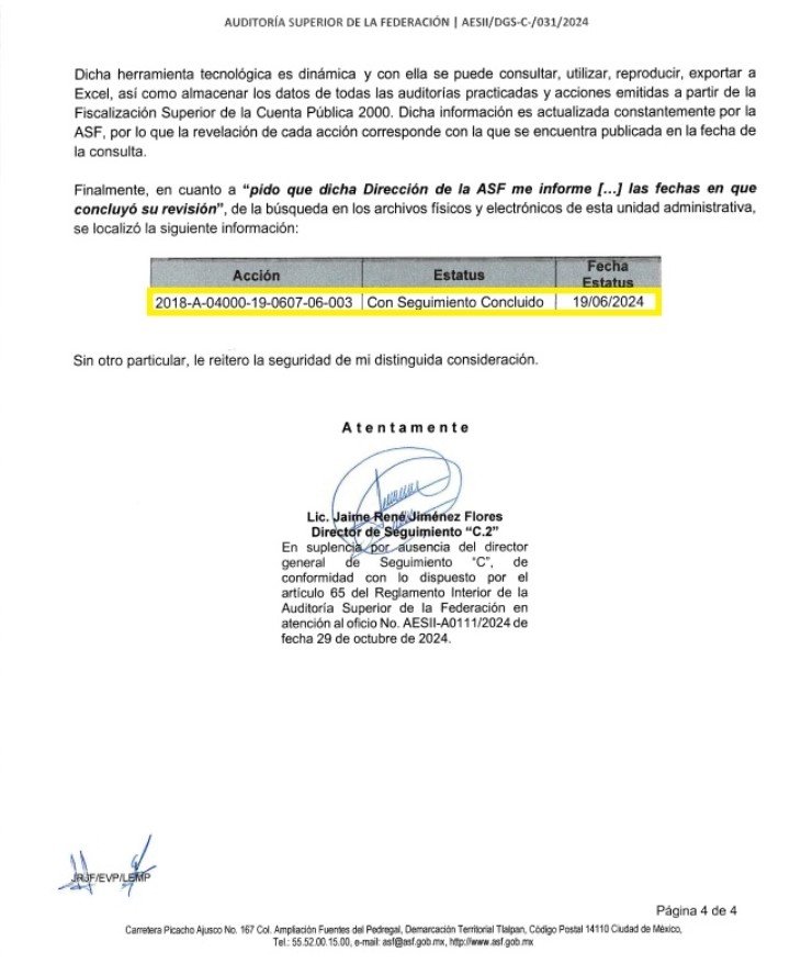 “Respuesta de ASF a solicitud de información en la que se comprueban acciones revisadas por el área que dirigió Ricardo Gabriel López Ruiz.
