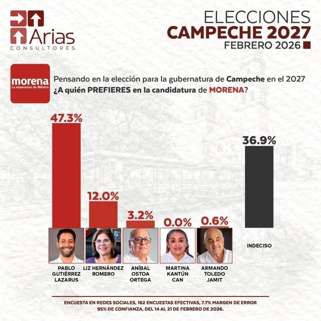 “Los resultados ofrecen una primera fotografía del escenario político del año, en la que Pablo Gutiérrez Lazarus emerge como el actor mejor posicionado, en un contexto donde Morena lidera las preferencias partidistas y la contienda rumbo a la gubernatura de Campeche en 2027 comienza a definirse”, dicen los periodistas.