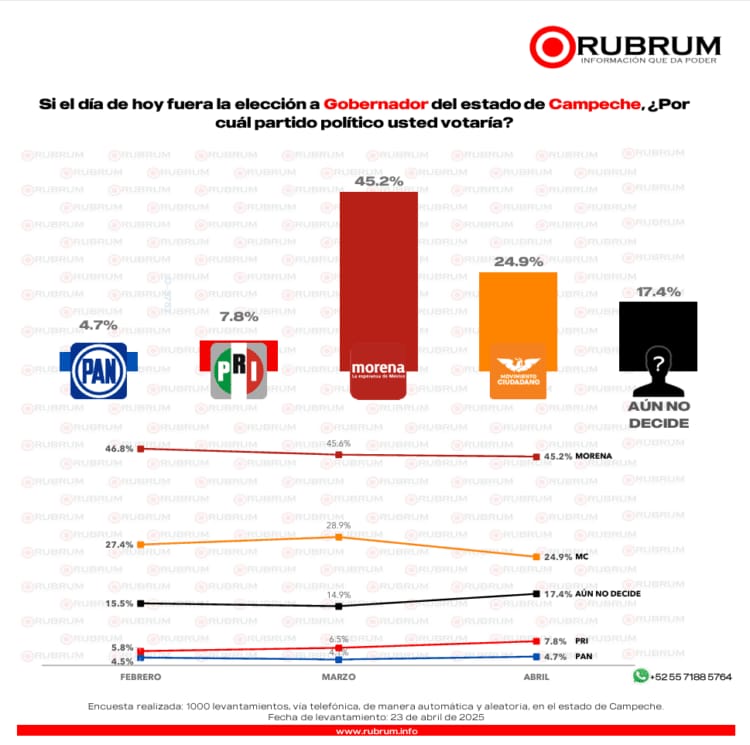 Siguiendo con la información de Ahora Campeche Radio se explica que en el “Panorama por partidos políticos”, va lo siguiente: en cuanto a la intención de voto por partido político, Morena se mantiene como la principal fuerza en Campeche, al registrar 42.7% de las preferencias, un contexto que refuerza el posicionamiento del aspirante mejor ubicado al interior del partido.