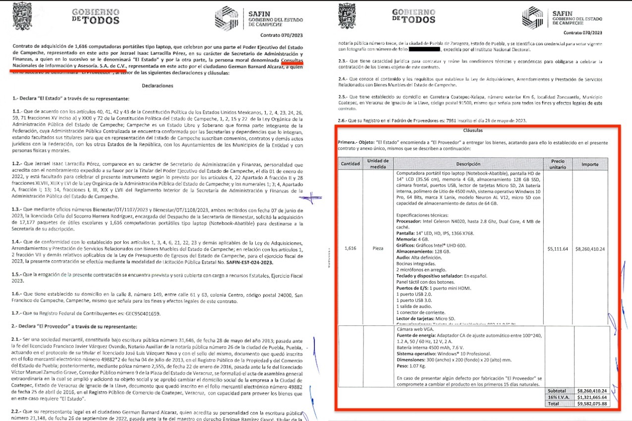 El otro contrato con número 070/2023 adjudicado a la empresa Consultas Nacionales de Información y Asesoría SA de CV el 3 de agosto de 2023 para 1,616 computadoras portátiles tipo laptop (Notebook-Abatible), pantalla HD de 14 pulgadas LCD (35.56 cm), memoria 4 GB, almacenamiento de 128 GB SSD, cámara frontal y puertos USB marca Lanix, modelo AL V12, incluye micro SD con capacidad de almacenamiento de datos de 64 GB.