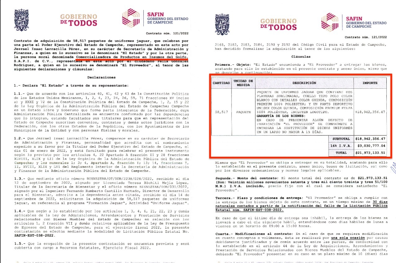 El contrato número 121/2022 fue firmado por la empresa Comercializadora de Productos en Insumos del Golfo SAPI de CV el 27 de octubre de 2022 para surtir 58 mil 517 paquetes de uniformes: 2 playeras sublimadas, cuello tipo polo color blanco con detalles color guinda, composición premium 100% poliéster; y un pants deportivo unisex color guinda, composición premium felpa 100% poliéster, incluye una bolsa con logotipo de Campeche, Gobierno de Todos, con la talla.