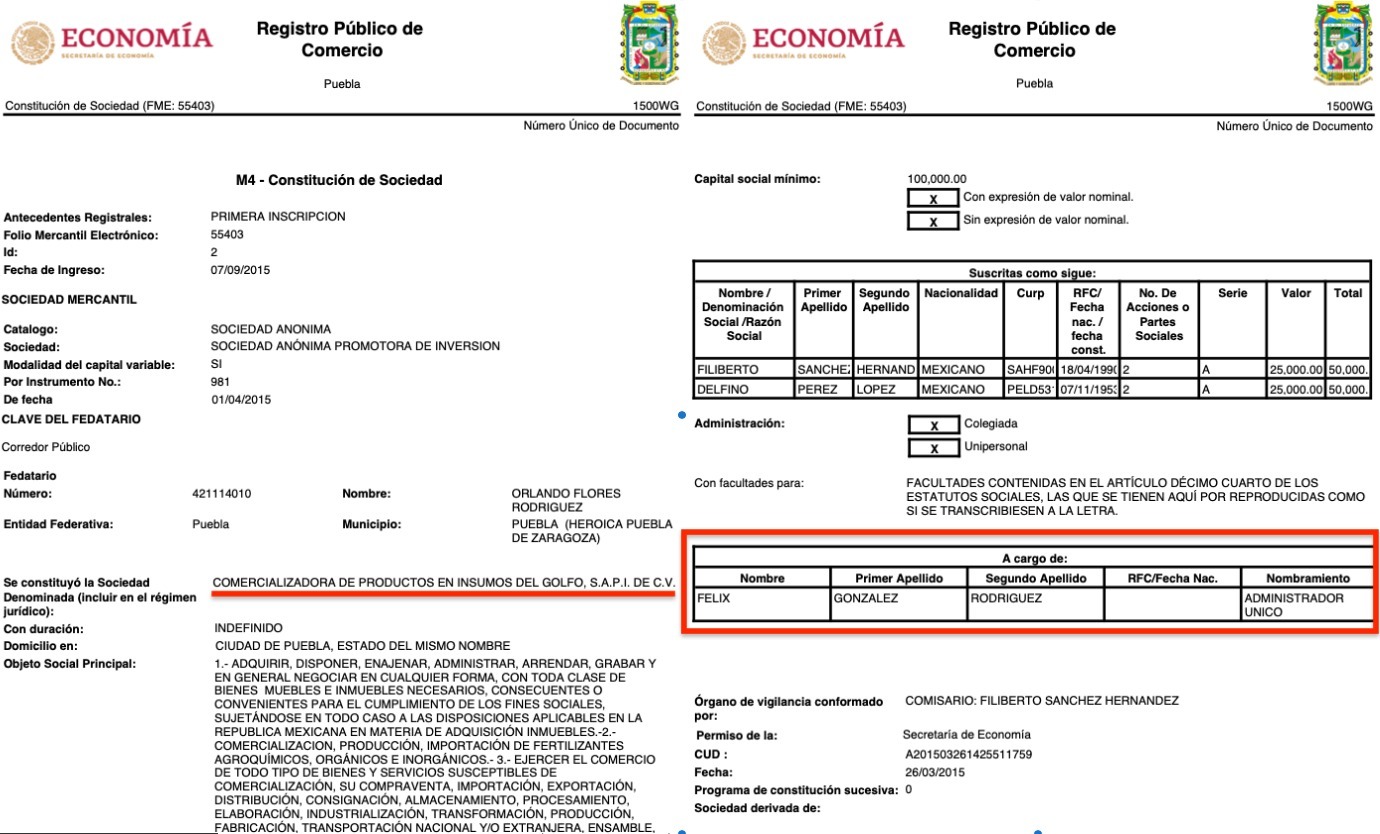 Según pudo investigar LA CHISPA, la empresa Comercializadora de Productos en Insumos del Golfo SAPI de CV fue constituida en Puebla, Puebla, el primero de abril de 2015 ante el Notario Público, Orlando Flores Rodríguez, y según consta en su Registro Público del Comercio aparecen como socios por partes iguales Filiberto Sánchez Hernández y Delfino Pérez López.