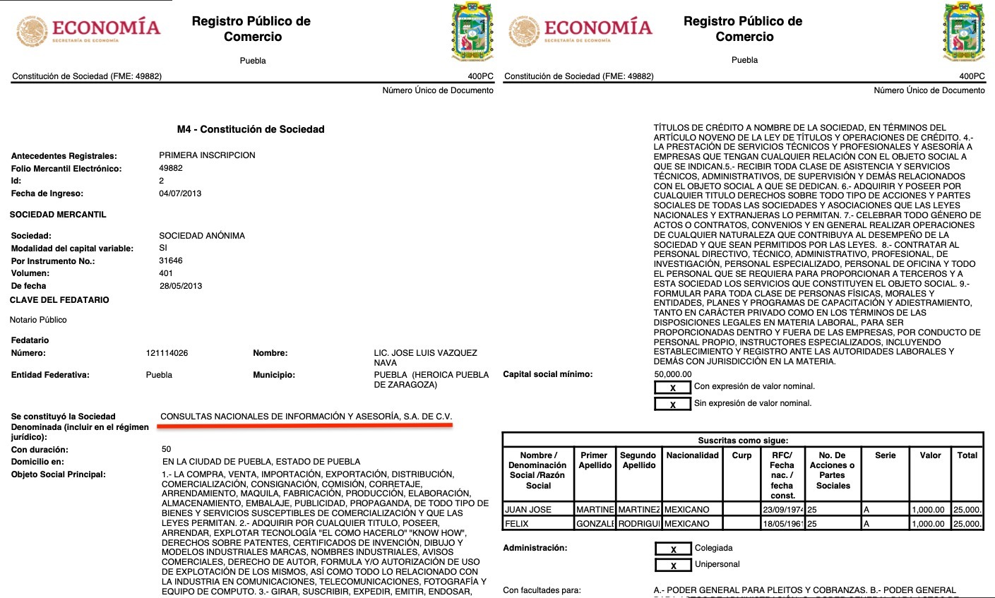 Por su parte, la empresa Consultas Nacionales de Información y Asesoría SA de CV fue constituida el 28 de mayo de 2013 ante la fe del Notario Público, José Luis Vázquez Nava, de Puebla, Puebla, y aparecen como accionistas por partes iguales Juan José Martínez Martínez y Félix González Rodríguez.